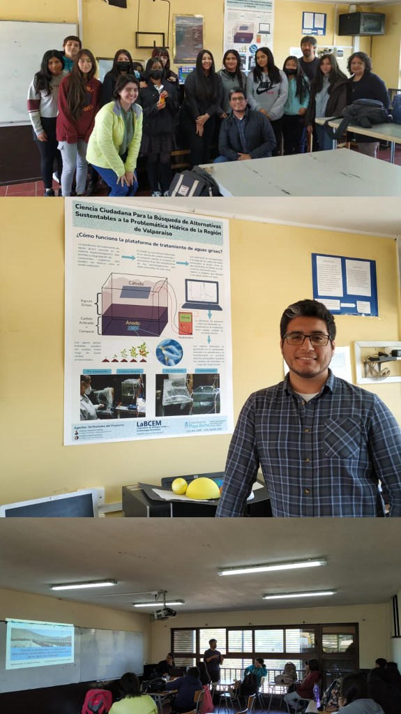 En el marco del proyecto “Ciencia ciudadana para la búsqueda de alternativas sustentables a la problemática hídrica de la región de Valparaíso” auspiciado por el Fondo Social CREA LAB 2023 de la Universidad de Playa Ancha, investigadores de LaBCEM visitaron al grupo de investigadores secundarios del colegio General Velásquez Bórquez, quienes presentaron los resultados acerca de la instalación de un prototipo para el tratamiento bioelectroquímico de aguas grises. De acuerdo al profesor Leonardo Badilla, coordinador del proyecto, las actividades realizadas no sólo permiten generar una oportunidad de reutilización de un recurso escaso, como lo es el agua en el contexto de cambio climático, sino también como una excelente plataforma educativa para visibilizar, monitorear y cuantificar ciertos procesos físicos, químicos y biológicos que ocurren en la plataforma durante los procesos de tratamiento (Sept, 2022).